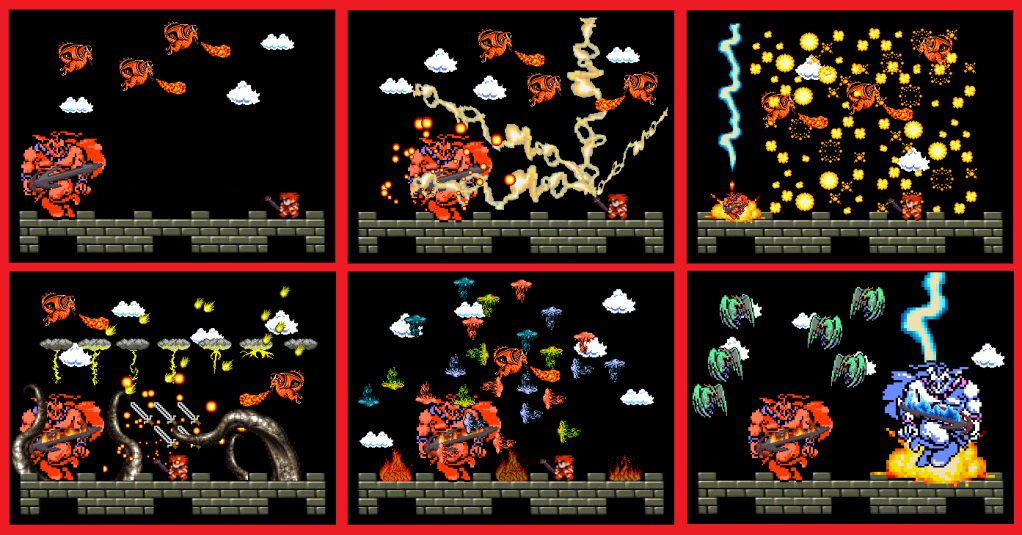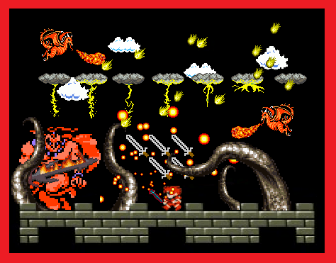 “Camliax!” Jack cries and braces himself for the worst. The effect is considerably more pronounced this time; sulfuric bubbles explode in mid-air, blazing meteors rain down, and a brace of tiny thunderclouds appear overhead, rumbling with unimpressive thunders and spitting tiny lances of lightning. A cloud of swirling swords appears over the combatants’ heads and flies toward the Giant, briefly engaging him in swordplay. Although the Giant succeeds in battering the blades away, he is wounded several times for his efforts. Hard on the heels of this manifestation comes the next in the form of giant muscular tentacles, which erupt from the castle roof and grapple any they encounter. A Wyvern, diving too near, is crushed by one of the powerful tentacles, while others bludgeon and batter the Giant, who repays their fumblings with vicious sword-strokes. The magic fades, leaving the Giant staggering for weariness.