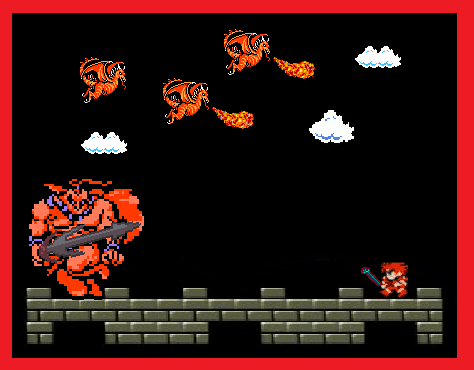 As Perilous Jack draws the Wand of Wonder and prepares for magical combat, the Giant draws his own weapon – not the broadsword on his back, but a small whistle of tin, shaped like the scaled head and throat of a red dragon. Placing his lips to the whistle, the Fire Giant blows a single, barely-audible note. Suddenly, as if they had been hovering there invisibly all along, a trio of snarling Wyverns appear in the sky. Their scales are flame-red, and like the Fire Giant, they glow with internal heat. The Giant advances, drawing his broadsword, and the Wyverns dive, flame dancing in their fangs. Suddenly Jack is outnumbered.