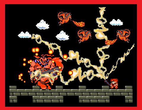 “Camliax!” he cries again, and this time a vivid bolt of magical fury lances down from heaven, striking the Giant. Meanwhile the atmosphere surrounding the battlefield suddenly erupts with brilliant, smoky explosions, which drive Jack to his knees and batter the already-dazed Wyverns. As he struggles to scramble and roll out of the way of the bursting fireworks, Jack catches a glimpse of the Giant’s fate – his foe has been reduced to man-size and is as hard-pressed as Jack himself to avoid the bursting fireballs. A Wyvern, battered into insensibility, tumbles to the castle roof and lands with a resounding crack that can only mean the creature has broken its spine. An instant later the twin magics fade; the Giant regains his stature if not his calm, and the atmosphere is silent again. The Giant snarls a command word and gives his broadsword an irritable shake. The huge weapon bursts into flame, and the Giant advances on Jack.