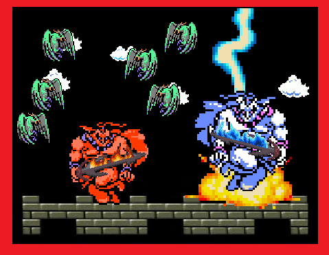 Jack cries the magic word again, determined not to lose the advantage he has gained. Terrific fires erupt from the roof of the castle, followed by what is undoubtedly the strangest of the Wand’s effects. From the sky rains a vari-colored assemblage of slime creatures, ranging in hue and potency from the relatively innocuous Green Slime, which dissolves flesh only with effort, to the Blacks and Crimsons who dissolve varying hardnesses of earth and stone, to the feared Whites, capable of consuming steel and etching the hardest gemstones. The last Wyvern falls screaming, smothered by a Black Slime, and others rain upon the broad shoulders and head of the Giant, sending the huge magician into an almost-comical apoplexy of furious dancing and scraping, from which he emerges alive but hardly intact. Badly wounded and alone, the Giant yet advances upon Jack, doggedly raising his flaming blade to attack. In the distance, a chorus of Eagle-screams signals the decisive end to this battle.