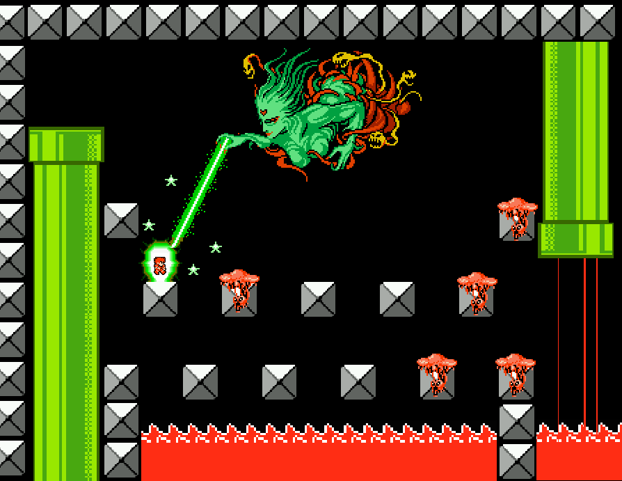 Jack pops the cork, swigs, leaps – and in a fraction of an eyeblink, the Emerald Guardian strikes him dead-center with a withering bolt of green energy. At first, he thinks her magic must have been a growth spell, for she suddenly appears so much larger, blotting out his sight. Then he realizes the terrible truth – he has been shrunk to a fraction of his size! He skids to a halt at the edge of the block on which he stands, realizing that there is no way he can make the leap across the now-dizzying gulf to the next block – where waits a Crimson Slime bigger than he is!