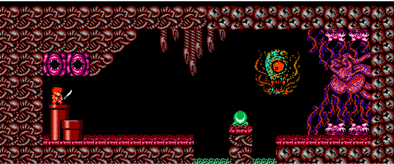 Whether this new chamber is a cavern in some strange and magical mountain or a pocket in the entrails of some cosmic monster, he cannot say. The walls are hot and yielding to the touch, and they pulse as if blood flows through them. Directly overhead two blind sets of grasping jaws stretch for him from the ceiling. Shuddering in disgust, Jack leaps to the spongy, mucusy floor. Across the chamber a huge organ is suspended between floor and ceiling, hanging like a spider in the center of a web of pulsing cords. Between the entrance Pipes and the suspended organ, a narrow pillar emerges from a hissing pool of green fluid in the center of the floor. Displayed atop the pillar is a radiant orb of glowing green glass, about the size of his two fists together. Jack realizes the Orb must be the key to the sealed Warp Portal in the Spike Room! He starts forward, reaching for the Orb.