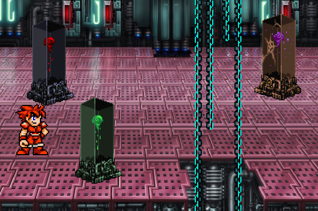 Strangest of all are three tall columns set in a triangle in the floor. They appear to be made of glass or crystal; each tinted a different color. The columns are filled with liquid or slime, in which float three large brains. The machinery is out of place in this room; the technology looks newer and of a different aesthetic compared to the rest of the room. Jack’s instincts scream “Illithid!” However, one thing is familiar about the columns: at the base of each is an interface shaped like the Keys that Jack possesses. It seems the columns each have an on/off switch.