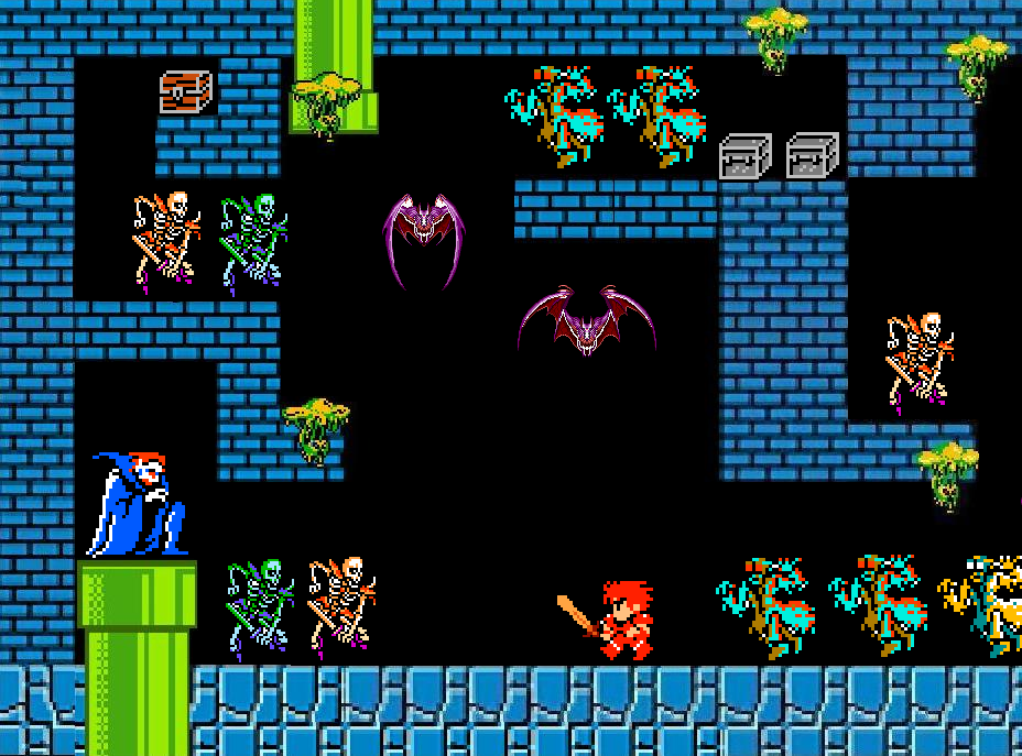 He falls a few feet, landing easily upon a solitary block suspended in a dim chamber of bluish stone. Something about his surroundings is uncannily familiar – but he has little time to consider, as the leathery wings of a giant bat brush his face. He lashes out reflexively with the Rune Sword, and the bat screams in a chillingly human-like voice as the steel bites into its flesh. The room is pitch black; Jack is only able to see by virtue of his magically enhanced eyes as the bat tumbles down to the barely perceptible floor below.
