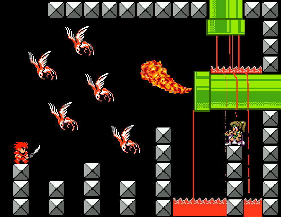 As if the precarious footing and the deadly pit were not enough to satisfy the sadistic whims of the room’s designer, there is the matter of the two Green Pipes which project into the room, one from the wall, the other from the ceiling near the far corner. Both Green Pipes ooze with molten lava, evidently part of the circulatory system of this machine castle, and the one projecting from the wall seems to serve the secondary function of burning off waste gasses, as there is an intermittent jet of flame billowing from its mouth.